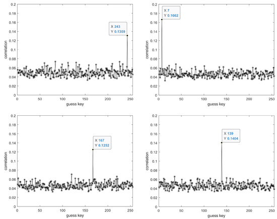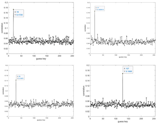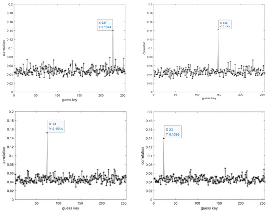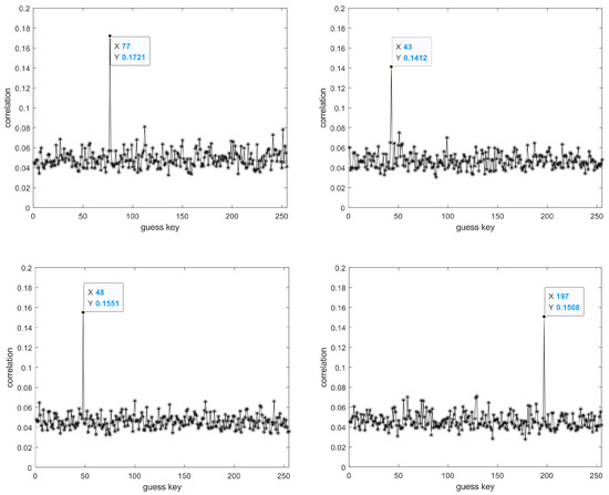 Figure 11. From left to right, top to bottom, the displayed results are the guessed key results for the 5th to 8th bytes, respectively.