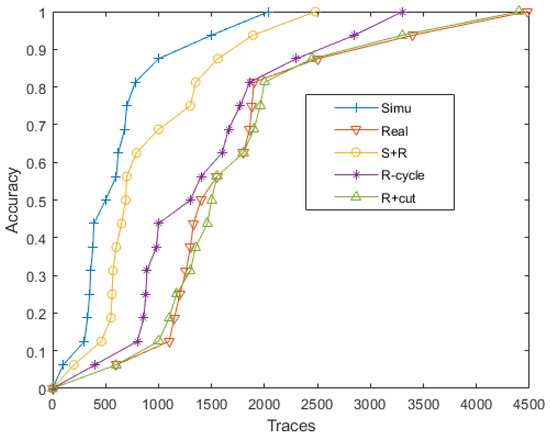We conducted some comparative experiments using real and simulated signals in Figure 14. In the legend, S represents the experimental results of the simulated signals, while R represents for the real signals. Since the simulated signals are noise-free clean signals in an ideal environment, they have a higher success rate. We compared the experimental results of real data using the data augmentation method presented in this paper with those obtained using traditional augmentation methods. This method can reduce the amount of data required for a successful attack and has better results than traditional geometric augmentation methods.