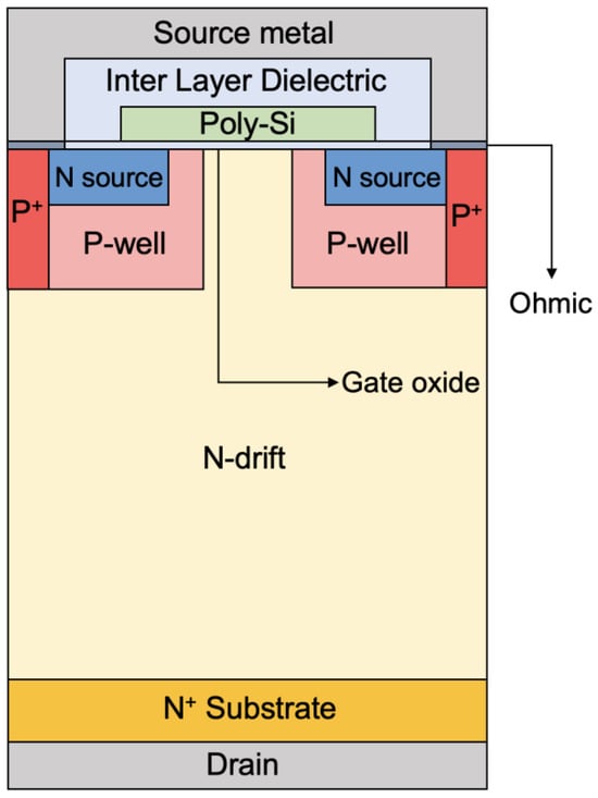 Silicon carbide (SiC) metal-oxide-semiconductor field-effect transistors (MOSFETs) have garnered attention in the field of power electronics, particularly for their high-voltage applications and utilization in radiation environments [1,2]. SiC MOSFETs have various merits, such as low on-resistance, small gate charge, outstanding dv/dt capability, and high-temperature reliability owing to their wide bandgap properties.