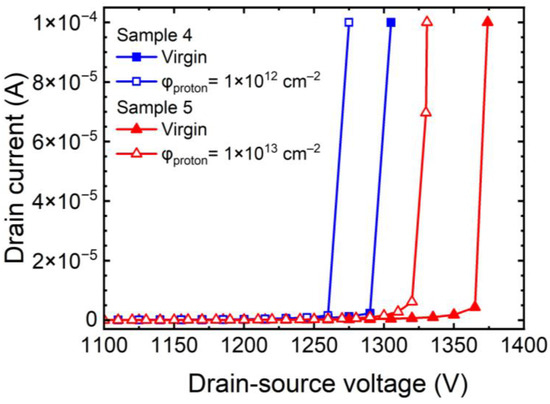 Figure 4 shows the transfer characteristics of 1.2 kV SiC MOSFETs before and after the proton irradiation. As the proton irradiation fluence (φproton) increased, the VT decreased so that samples 4 and 5 had ΔVT of 0.398 V and 0.776 V, respectively. The VT decreases induced by the hole traps were created due to the TID effects caused by high-energy proton irradiation. Decreasing VT results in unintended turn-on, increased leakage current, and degraded breakdown characteristics, which could lead to power loss or reduced reliability.