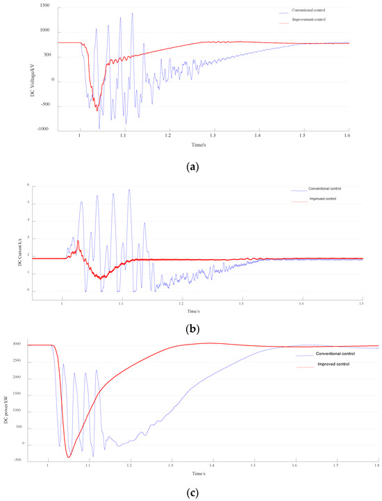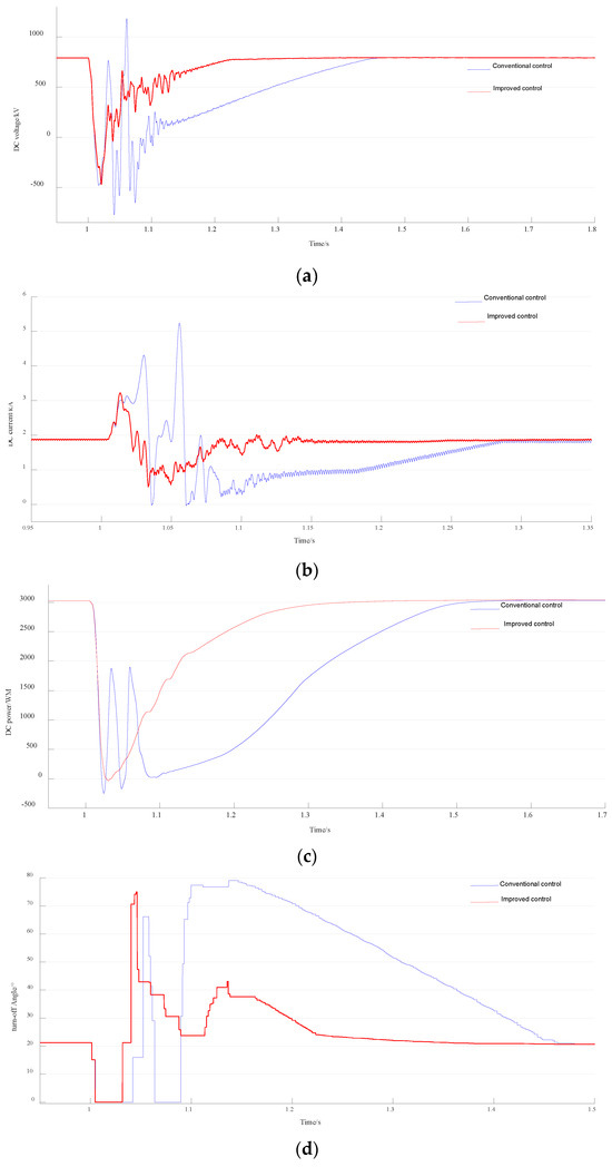 In this example, a single-phase grounding fault occurs in the LCC-UHVDC system, and the grounding impedance is 0.05 H. The time when a ground fault occurs is 1 s, and the fault duration is 100 ms. Figure 7 shows the simulation results under different control strategies. The red waveform represents the improved strategy proposed in this paper, and the blue waveform represents the system under conventional control.