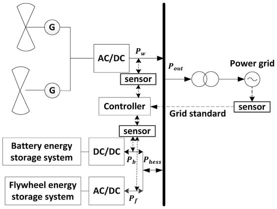 A diagram of a wind power flywheel–battery HESS and its grid-connected structure is shown in Figure 1. The structure is mainly composed of three parts: a wind farm, a BESS (energy-type), and a FESS (power-type) (composed of HESS and control system). The function of the control system is to collect the real-time power signal of the wind farm and control the charging–discharging state of the HESS in real time under the constraints of the grid-connected wind power grid standard to effectively suppress the fluctuation of wind power output.