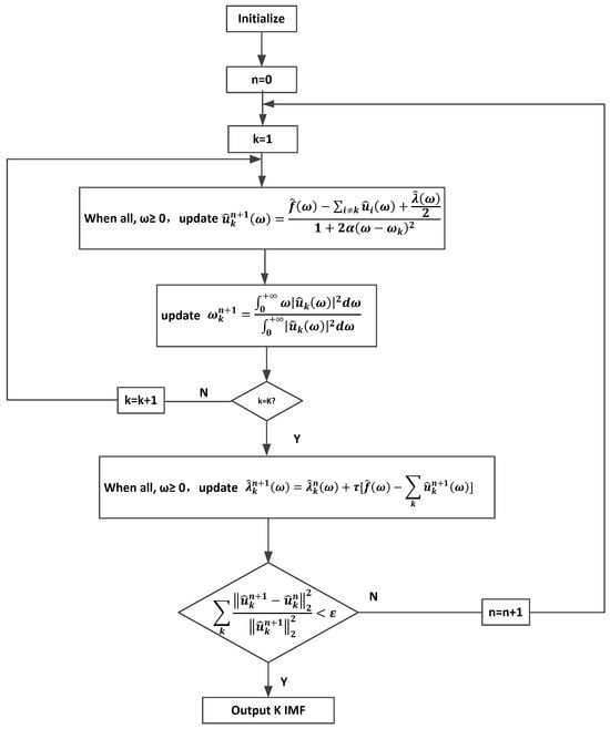 where , , , and are the Fourier transforms of , , and , respectively. A flow chart of the VMD algorithm is shown in Figure 2.