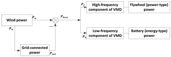 where is the active power in MW emitted by the wind farm; is the grid-connected power; is the charge–discharge power of the BESS in the HESS; is the charge–discharge power of the FESS in the HESS; is the charge–discharge power of the HESS. It is specified here that when is positive, it means that the HESS is charged, and when is negative, it means that the HESS is discharged.