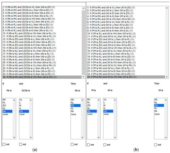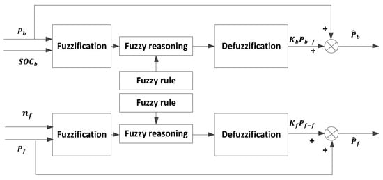 The VMD algorithm, after parameter optimization, completed the primary power distribution but did not take into account the fact that the overcharge and over discharge of the energy storage device will seriously affect its life, especially for the battery system, where the high cost per unit capacity limits its energy storage capacity. Therefore, based on the primary allocation, the SOC of the BESS and the speed of the FESS were considered, and the fuzzy control rules were adopted to make the second correction of the power instruction in real time []. The fuzzy control process is shown in Figure 6. The corrected power instruction is as follows: