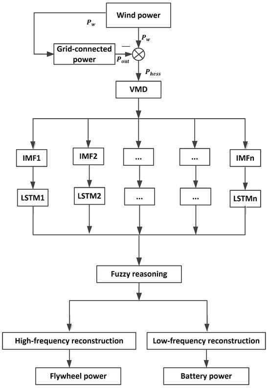 The structure of the paper is organized as follows. In Section 2, the principle of the LSTM-optimized VMD algorithm is introduced in detail. In Section 3, first, the sliding average algorithm is used to determine the charging–discharging power grid power and the HESS. Second, the LSTM-optimized variational mode decomposition algorithm is used to decompose the HESP into a series of sub-modes with frequencies from low to high to complete the primary power distribution of the HESS, and the primary power of the HESS is modified according to the rules formulated by fuzzy control. In Section 4, the feasibility and superiority of the proposed method are verified using a simulation example.