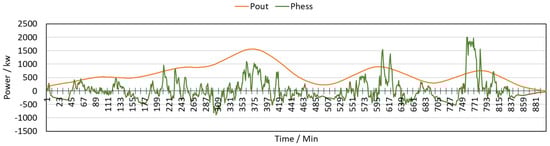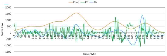 The wind power, grid-connected power, flywheel power, and battery power were integrated into a chart, as shown in Figure 15.