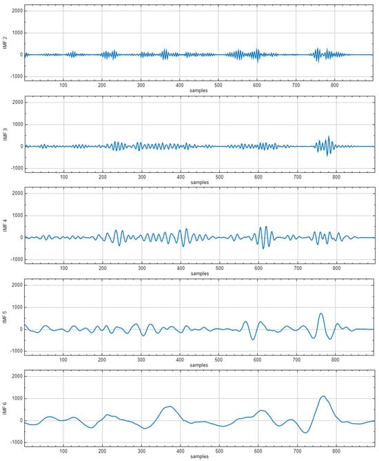 According to the preliminary power decomposition in Formula (19), IMF1-IMF3 was selected for low-frequency and IMF4-IMF6 for high-frequency decomposition.