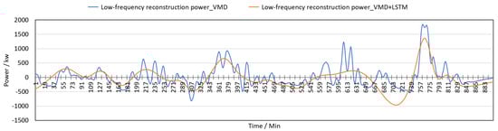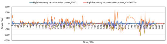 After the grid-connected power and HESS power are obtained, the proposed LSTM is used to optimize the VMD parameters, and the HESS power is decomposed into a series of IMFs with frequencies from low to high. The boundary point of the high- and low-frequency components was determined by observing the signal characteristics of each IMF in the frequency domain, and the IMF is reconstructed. The reconstruction power is as follows:
