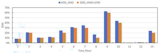 According to the primary power distribution and the secondary power correction based on fuzzy reasoning, the battery system power is the low-frequency power component of the HESS. Figure 13 shows the reconstruction curve, and Figure 14 shows the comparison of the depth of discharge (DOD) of the battery system. By comparing and analyzing the curves with LSTM optimization to those without LSTM optimization, it can be seen that the low-frequency power curve with LSTM optimization has less fluctuation, and the depth of charge–discharge is shallower. This avoids the overcharge and over discharge of the battery, delays the attenuation of the battery system, and prolongs the service life.
