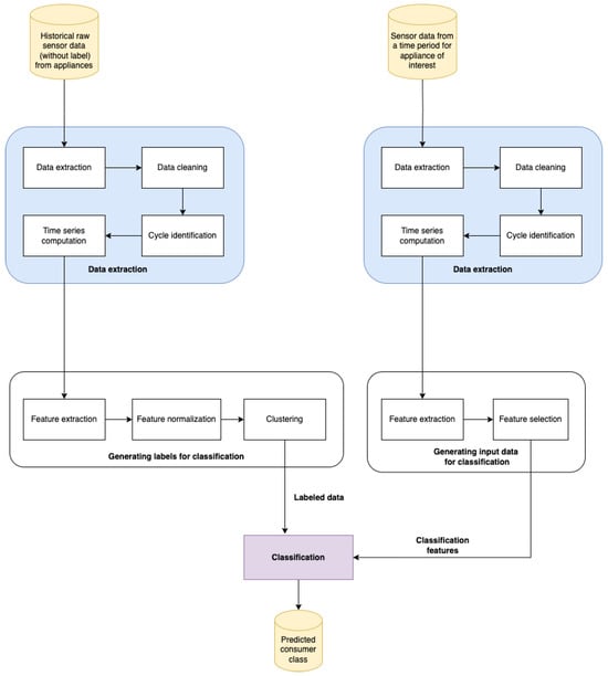 Our system’s input consists of data recorded by sensors attached to devices that are automatically sent to a data lake system from which we can further process them. Our output is a predicted consumer class.