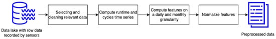 Our data extraction module is composed of four components: identification of relevant data and extracting them, data cleaning, cycle identification, and time series computation. Due to the nature of the data (which can be classified as big data), the first appropriate step is extracting the usage data of interest to overcome the dataset dimensionality complexity. The next step is the semantical and syntactical cleaning of the raw data. In previous work [], we introduced a comprehensive and versatile methodology tailored for the analysis and cleaning of data. This methodology offers insights and techniques that can be effectively adapted to address our study’s unique challenges and requirements.