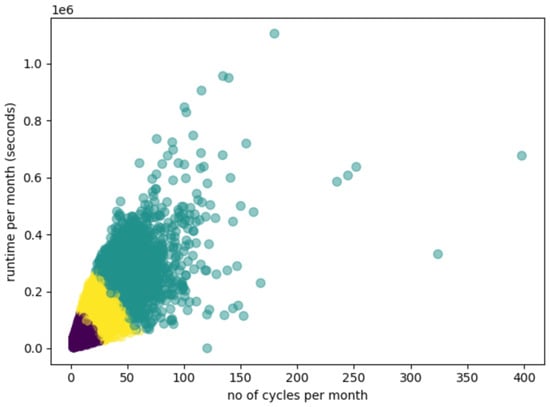 We projected the data into a two-dimensional space to visualize the clustering results by selecting the most significant features. Figure 4 presents the data projection from appliance type 1 for k = 3. We have the average number of monthly cycles on the OX axis and the average runtime per month in seconds on the OY axis. One point represents one appliance, and the color of the point represents the class of that appliance after clustering.