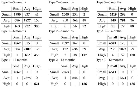 The progression of results in the classification, as influenced by the selected time interval, demonstrates that the number of misclassified items remains small compared to the overall sample size when we use a more extended time range. In the case of 3-month data, most of the errors in classification are with the neighbor class. When extending to 6 months of data, the overall number of wrongly classified instances is half of the initial ones, while for the further away class, it either disappears or becomes negligible.