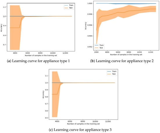 When we used a training set of 5000 instances for all three types of devices, it resulted in an accuracy of over 99.70% with a standard deviation smaller than 0.25%. In Figure 6a,c, for appliance types 1 and 3, there is an inflection point of around 5000 instances used in the training set. In the case of appliance 2, this inflection starts earlier, but there is a smaller increase after using around 5000 devices. For all instances when using more than 10,000 samples in the training set, the increase in accuracy tends to be constant.