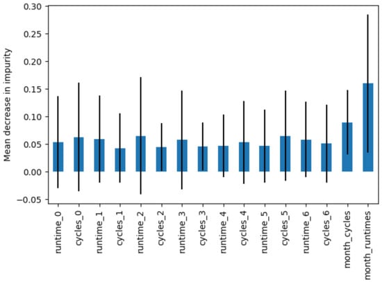 Feature set. We additionally assess the significance of the features employed in the classification task by employing random forest. The feature set comprises run times, cycle numbers for each weekday, and the average number of cycles and average runtime per month. Figure 7 depicts the outcomes obtained from appliance type 1 data, with blue bars indicating the feature importances within the forest and black lines representing their variability across trees. The feature importance is determined based on the mean decrease in impurity in the accumulation and the standard deviation within each tree.