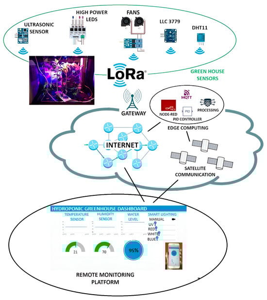 The proposed architecture for this smart hydroponic greenhouse empowers the monitoring of air temperature, air humidity, water levels under plant roots, and light intensity. This monitoring ensures the stabilization of environmental parameters, creating an optimal setting for the cultivation of tomato plants. All IoT devices deployed within the hydroponic greenhouse are seamlessly connected to edge computing, utilizing the new LoRa modulation at 2.4 GHz. This strategic choice is particularly pertinent, as greenhouses are commonly situated in rural areas, often plagued by poor or non-existent network connectivity. Sensor data undergo processing on an edge computing server and, specifically, light intensity is regulated through a proportional–integral–derivative (PID) controller. Additionally, Node-RED facilitates data processing in the edge cloud, providing tools to craft a graphical interface for farmers or users. This interface empowers them to remotely modify operational parameters using an intuitive and user-friendly app on their smartphones.