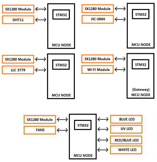 Subsequently, the system transitioned from a single MCU node to multiple nodes, significantly enhancing its capability to address real-world use cases. This evolution exemplified the system’s inherent flexibility, demonstrating its ease in accommodating new services and devices for monitoring additional parameters or incorporating extended features. Each type of sensor became associated with a distinct MCU node, and all MCU nodes were equipped with the SX1280 Semtech chip for communication with the LoRa gateway. This architectural decision was driven by the necessity in real-world scenarios, where sensors are often positioned at various locations, and they may be situated at a considerable distance from the gateway. Figure 2 illustrates the block diagrams of the MCU nodes.