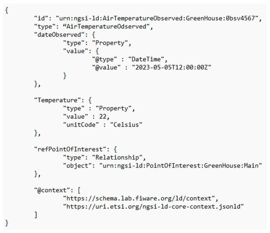 NGSI-LD is an information model to support linked data []. The main constructs of NGSI-LD are entity, property, and relationship. Properties are a combination of an attribute and its value. Relationships allow to establish associations between entities using linked data. Typically, the NGSI-LD message formats have only one or two levels of property or relationship. JSON-LD, a JSON-based serialization format for linked data, allowed to develop this new format, expanding JSON in terms of URIs to define terms unambiguously. Figure 3 shows an example of a typical message format used in our system when a temperature sensor generates a message.