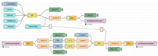 We employed the Node-RED Flow-Based Programming (FBP) tool, developed by IBM’s Emerging Technology Services team and currently under the OpenJS Foundation, to create an IoT application with web services. The process of developing software with Node-RED v12.22.9 is remarkably straightforward, eliminating the need for coding and allowing intuitive programming with minimal operations. Node-RED offers a browser-based GUI, utilizes lightweight protocols, encapsulates functions as nodes, and is easily accessible via the cloud. In this project, Node-RED was utilized to establish a virtual IoT device that processes data from various sensors within the hydroponic greenhouse. Smart lighting, for example, consisting of four high-power LEDs and one spectrometer, is presented as five physical IoT devices. Similarly, temperature and humidity web services are depicted as two separate virtual IoT sensors on the dashboard, although they correspond to a single physical sensor (DHT11) in the system. Additionally, Node-RED showcases virtual IoT devices and sensors in the hydroponic greenhouse as web services through the dashboard.