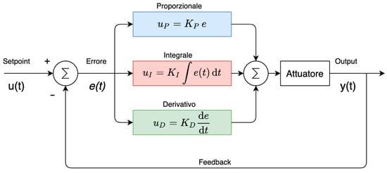 Equation (1) describes the algorithm implemented by the PID controller node on the Node-Red server, whereas Figure 6 shows the block diagram with three main blocks: proportional, integral, and differential.
