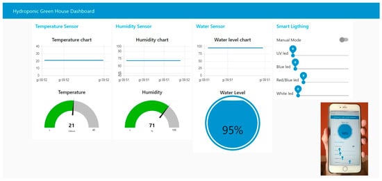 The dashboard incorporates graphs, facilitated by the Node-RED-dashboard 3.4.0 plugin based on Angular v1. It includes on–off switches and sliders to enable the visualization of monitored data and interaction with the hydroponic greenhouse, specifically with smart lighting devices. Figure 8 shows the GUI of our GymHydro. Our aim was to demonstrate how the approach used in our work makes it easy to implement simple and intuitive dashboards, with the ability to modify them easily based on individual user needs.