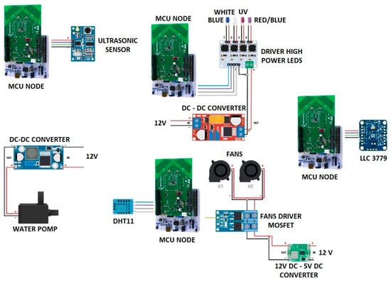 To demonstrate the benefits of a modular approach, at the beginning, we used a single MCU node connected to a LoRa gateway to obtain information from the sensors and send commands from the Node-RED server to the actuators. The MCU node had the STM32 chip (STM, Geneva, Switzerland) and the SX1280 module to communicate with the gateway. The MCU node was connected to four high-power LEDs (UV, Red/Blue, Blue, and White), one temperature and humidity sensor (DHT11 []), one ultrasonic sensor (HC-SR04 []), one spectrometer (Adafruit Industries LLC 3779 []), and two fans. Each high-power LED had 10 W of power and its light intensity was controlled by a PWM signal. The ultrasonic sensor was used to control the water level under plants. Two fans were used to emulate the wind: this was necessary to increase the robustness of the plants’ stems and is also useful during pollination. A spectrometer monitored the light intensity at any visible wavelength. This information was given as input to a PID controller, which allows for controlling the lighting obtained from the four high-power LEDs.