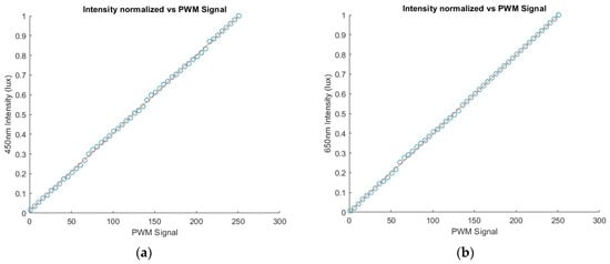 In the equation, ‘f(x)’, where ‘x’ represents the PWM signal provided, ‘m’ is the angular coefficient, ‘q’ is the y-intercept, and ‘T’ is the maximum PWM signal possible (in our case, 255). The linearity of the process was affirmed through a linear regression analysis of light intensity measurements at 450 nm and 650 nm, as depicted in Figure 10.