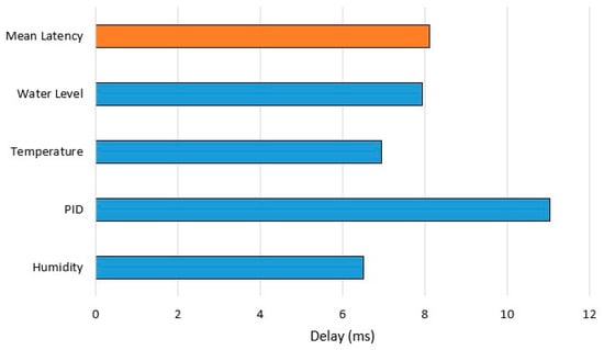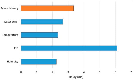 Figure 13 and Figure 14 present an analysis of the mean processing latency in two key scenarios. Figure 13 illustrates the processing latency on the public cloud for single-message processing (e.g., water level, PID controller, temperature, and humidity). Meanwhile, Figure 14 depicts the mean processing latency on the Raspberry Pi 3 at the network’s edge. Notably, transitioning computing from the cloud to the edge resulted in an increase in latency, growing from 3.34 ms to 8.11 ms.