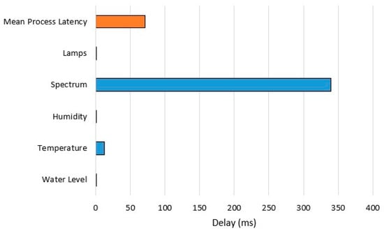 Our evaluation primarily centered on assessing and quantifying several delay factors introduced by diverse field devices, including temperature sensors, humidity sensors, spectrometers, water level sensors, and lamps. Additionally, we conducted measurements to gauge the network round-trip time (RTT) at the application layer, capturing the total time taken for a message to travel from a sensor to the Node-RED server and back. Moreover, we examined the processing latency induced by two distinct processing environments: public cloud computing and edge computing. This analysis aimed to shed light on the individual contributions of these processing methods to overall system latency. The network RTT represents the total delay experienced by a message as it traverses the network from the sensor to the Node-RED server and back to the sensor. This delay encompasses various stages of communication, including transmission, propagation, and reception. At the outset, when a message is dispatched from the sensor, the RTT begins accumulating. As the message travels through the network, it encounters delays associated with data transmission and propagation, influenced by factors such as network congestion and distance. Upon reaching the Node-RED server, the message is processed, and the server responds by sending the processed data back to the sensor. Importantly, the RTT does not include any processing time during this round trip. Processing latency refers to the duration of time between when a message is received by the Node-RED server and when it is subsequently sent by the server. This delay encompasses the time required for the server to process the incoming message, which may involve various computational tasks, such as data analysis, decision-making, or formatting for transmission. The sensors’ delay encompasses the time taken by sensors to fulfill their fundamental tasks within the system. This delay originates from the processes involved in capturing data related to environmental parameters, formatting these data into a suitable message format, and transmitting them to the designated destination.