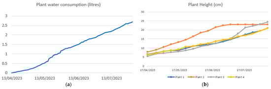 Monitoring the water level is essential for calculating the water uptake of the plants throughout their growth. Figure 17a presents the water uptake during the observation period (13 April to 1 August 2023) for a tomato plant.