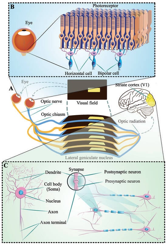 Visual system: (A) flowchart of visual system; (B) organization of the retina; (C) dendritic neuron.
