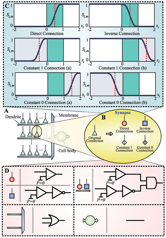 Main components of the DNM: (A) architectural description of the DNM; (B) four kinds of synapses; (C) six cases of connection states; (D) the logic circuit gate represented by each connection state.