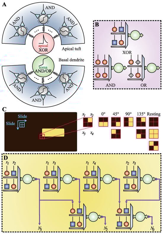 Recent advances in morphology, physiology, and developmental biology have demonstrated that the microcircuit plays a crucial role in the activity of cortical neurons, such as the generation of direction selectivity [77,78]. Studies have confirmed that the interaction between synapses and dendrites can only perform simple logical operations [79,80,81,82]. The active electrical property of a dendrite lays the foundation for neural computation, which is also the basis of the brain [83]. As shown in Figure 3A, the human layer 2/3 cortical neurons can implement logical AND, OR, and AND operations, and a related model has been proposed [84]. It is worth mentioning that the DNM can perfectly realize this biological model, and the corresponding models are presented in Figure 3B.