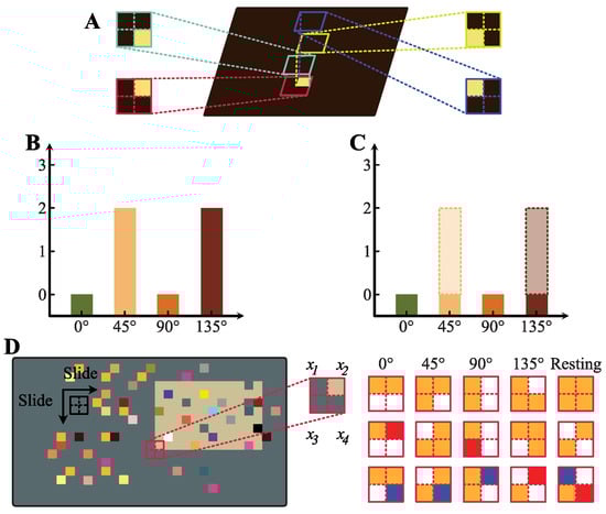 However, the results of the noise experiments show that although ODS-01 is simple, its anti-noise ability is very poor. In addition, we found that ODS-01 is not foolproof. To be specific, when the object in the image has only a single pixel, there is no doubt that it has no orientation information, which is shown in Figure 4A. From Figure 4B, we can observe that ODS-01 shows the same response in and orientations, which is undoubtedly inconsistent with the facts. We further hypothesize that neurons inhibited each other in response to neurons with supplementary angles and propose the second-generation orientation detection mechanism (ODS-02) [91,92,93]. It can be found that the responses of ODS-02 in and orientations counteracted each other, which is shown in Figure 4C. Finally, differences in intercortical connections can lead to a diversity of circuits [94,95]. Considering the diversity of colors in color images, we refine and propose the third-generation orientation detection mechanism (ODS-03), which is presented in Figure 4D.