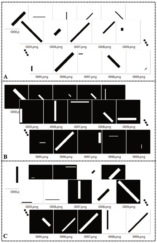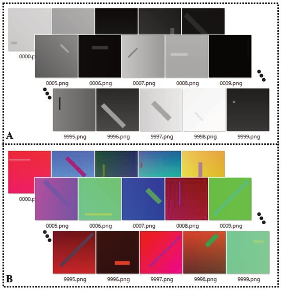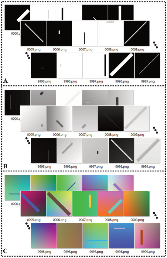 In our experiments, nine image datasets are used to estimate the performance of ODSs and a randomly positioned bar with arbitrary size and orientation in each image, which are described in Figure 5, Figure 6, Figure 7 and Figure 8. Each of the first eight datasets contains 10,000 images. In the first five datasets, the image size is 100 × 100 pixels, which are generated randomly. In our generating process, the shapes are fixed in order to define the orientation more easily, and the specific labels of their own orientations are given by observation. In the first dataset, the background of the image is set to be white and the object is black. On the contrary, the object is white and the background is black in the second dataset. In the third dataset, the colors of the background and objects are generated randomly. Grayscale images are considered in the fourth dataset, which is also determined randomly. To further examine the effectiveness of the mechanism, color images are utilized in the fifth dataset. The colors of the background and objects in the color dataset are also randomly generated. With the advancement of technology, the capacity of photographs to cover the fine structures of the actual world has been improved [96]. In the last decade, large-scale visual recognition has become a challenge and has attracted the attention of many researchers [97]. Therefore, large-scale binary, grayscale, and color images (1000 × 1000 pixels) are adopted in the next three datasets. Finally, the actual photographs (3024 × 3024 pixels) are selected to estimate the utility of the mechanism. We use different long objects that can be found in our daily life such as pencil, remote controller, sticky notepad, spoon, and so on as the subjects of this study. All experiments are independently performed 30 times to avoid statistical randomness.