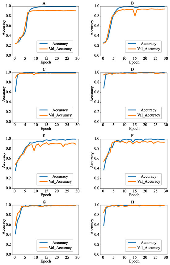 Training curves of CNNs. (A) Training curve of CNN-04 with one convolutional layer. (B) Training curve of CNN-04 with two convolutional layers. (C) Training curve of CNN-04 with three convolutional layers. (D) Training curve of CNN-04 with four convolutional layers. (E) Training curve of CNN-30 with one convolutional layer. (F) Training curve of CNN-30 with two convolutional layers. (G) Training curve of CNN-30 with three convolutional layers. (H) Training curve of CNN-30 with four convolutional layers.