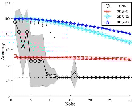 In this section, in order to further verify the ability of the ODSs to resist noise, salt-and-pepper noise is added to the color images (100 × 100) dataset to evaluate the performance of the mechanisms. The experiments are carried out on a wide range of noise densities, which are set within a range of 1% to 30%. In addition, the best performing CNN-30 in the previous section is employed as a competitor, which has four convolutional layers. It can be clearly observed in Table 5 that the accuracy of all mechanisms has declined even if the noise is only increased by 1% (100 pixels). Noise causes the accuracy of the CNN to decrease, and the large values indicate that the CNN is extremely unstable. The CNN has completely lost its detection ability once the noise density reaches 12%. The accuracy of ODS-01 suggests that ODS-01 basically has no anti-noise ability. We speculate that this is due to the lack of inhibition mechanism, which is proved in the experiments with ODS-02. Compared with ODS-01, the accuracy of ODS-02 has been significantly improved. The accuracy of ODS-02 can still be maintained at 93.78% when the noise density reaches 12%. Even if the noise density is increased to 30%, the accuracy of ODS-02 can still reach 68.87%. The performance of the more refined ODS-03 has been further improved when compared to ODS-02 and maintains accuracy at 80.25%. The statistical results show that ODS-03 significantly outperforms CNN and ODS-01 in all cases of added noise density. Compared with ODS-02, ODS-03 can achieve comparable performance at 1% and 2% of the added noise density. As the noise density increases, the advantages of ODS-03 gradually emerge, enabling it to perform significantly better than ODS-02. Shaded error bars are also provided in Figure 10, which contains continuous shaded error regions around the accuracy lines rather than discrete bars. We can observe that the std value of the CNN is very large, while those of the ODSs are hardly noticeable. ODS-03 always produces the best results and has the slowest decline in its accuracy curve. Therefore, it can be concluded that ODS-03 not only has an excellent performance in orientation detection but also outstanding anti-noise capability.