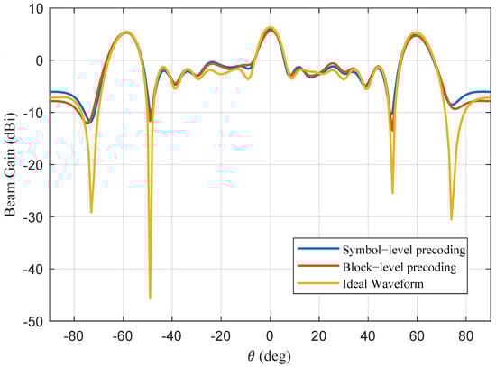 Over the past few years, there has been a notable surge in research efforts aimed at optimizing ISAC beamforming, resulting in improved quality of ISAC functions. In [], the authors designed an algorithm to reduce the complexity of beamforming where the two subsystems of communication and radar are co-located on the same BS. The authors of [] introduced a new symbol-level precoding (SLP) technique into ISAC and studied the related waveform design technology. The principle of SLP based on quadrature phase shift keying is shown in Figure 1. It mainly uses interference signals to make the received signal more conducive to decision-making. The radar beam diagram without modulus length constraints is shown in Figure 2. Simulation results show that both block-level precoding and SLP can achieve better beam gain. In [], the authors enhanced the beam shape through the optimization of the waveform based on OFDM. The authors of [] studied DFRC beamforming for MIMO radar sensing and multi-user MIMO (MU-MIMO) communication to propose a generalized beamforming method. In [], the authors combined space–time adaptive processing (STAP) and SLP to propose a STAP-SLP-based ISAC system. An interrupt-based DFRC beamforming design is proposed [], which can sense imperfect channel state information to achieve high communication rates and detect passive targets. In [], a design for block-level beamforming in ISAC systems is proposed, which introduces a finite alphabet input. This approach is more realistic compared to the original infinite-length Gaussian signal. In [], the authors introduced a new packet SLP strategy and optimal algorithms to address the max–min fair problem and power constraint problem. The authors of [] studied the problem of maximizing the EE of ISAC systems under the premise that user communication and radar sensing are simultaneously ensured at the BS. A multivariate alternating minimization framework [] is proposed to address the non-convex issue of optimizing the performance of communication and radar. In [], an alternating minimization framework is developed to address the problem of minimizing the MSE of the designed beamforming and the target beampattern under the constraints of communication quality of service (QoS).