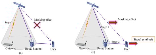 The basic relay structure is shown in Figure 3a. In HSTRN, the masking effect hinders the user from establishing a stable communication link with the satellite. However, through the implementation of terrestrial relays, satellite users can maintain communication when the direct link experiences masking. This contributes significantly to enhancing the stability of the overall system. The cooperative relay structure shown in Figure 3b does not incorporate the masking effect in the direct link between the satellite and the user. Therefore, signals from the direct link can be merged into the signals obtained by the transmission of relay nodes.