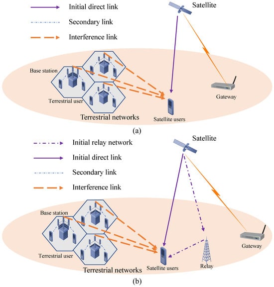 With the growing demand for wide-band communications and a large number of connectivity devices, the spectrum scarcity of satellite communications becomes an imminent issue. It is a feasible method for rational sharing of spectrum resources to optimize the efficiency of spectrum resource utilization []. Cognitive radio (CR) is considered as a spectrum management approach in conventional wireless communication systems It allocates the same spectrum resources to both major and minor networks, which enhances spectrum utilization rate []. In this way, we can classify them into cognitive relay networks and cognitive satellite–terrestrial networks.