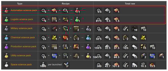 Science packs are essential items that enable further in-game research, unlocking new recipes for crafting advanced items. These packs are, therefore, instrumental for game progression. Factorio has seven different science packs, as shown in Figure 1, but for this paper’s scope, the selected science packs will suffice.