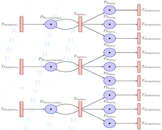 Here, the places in the Petri Net model represent various conveyor belts responsible for holding unique items, e.g., iron plates, copper plates, etc. Based on a round-robin approach, the transition then decides which next belt the items should be sent to. The final places in this model represent the output belts for this model and have their distinct destination in terms of output ports.