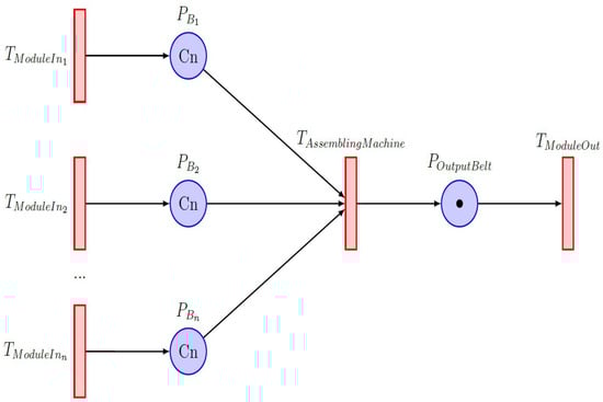 The last module in our model is the Assembling Machine module, which is responsible for crafting new tokens. This Petri Module can be seen in Figure 7, where denotes the number of materials required for crafting the specific item. The module receives tokens from the Main Bus module via the transition port. The number of incoming transition ports for this module depends on the number of unique materials in the recipe required for crafting the new item. The crafted item exits the module through the transition port, eventually reconnecting with the Main Bus.