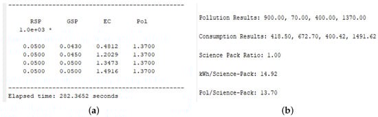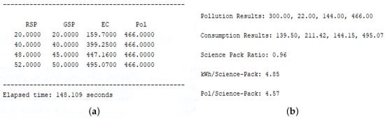 Figure 8b shows performance metrics calculated based on the simulation, such as energy consumption/pollution per science pack, total costs and the ratio between science packs. These numbers can then be used to calculate a score using the custom scoring function described previously in Equation (2).