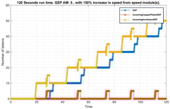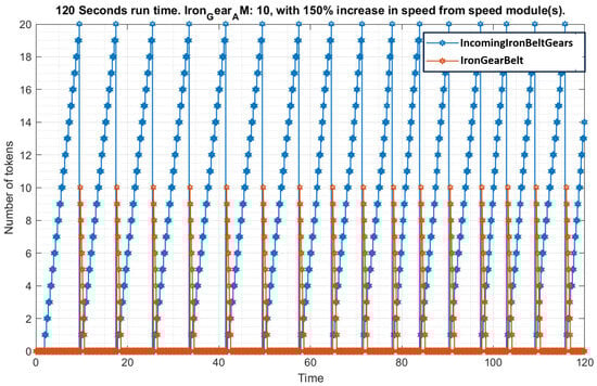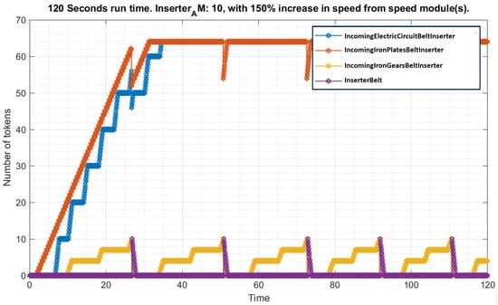 Figure 16 shows the token count for places in the resource extraction module. After about 10–15 s of running our simulation, we have reached a maximum capacity of 160 tokens for the output belt for both copper and iron.