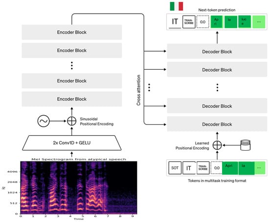 In this study, we used the CapisciAMe database to explore its synergy with a state-of-the-art (SOTA) ASR architecture, which is OpenAI’s Whisper, and we specifically investigated the fine-tuning of three configurations of the same model with our corpus of Italian atypical speech. Whisper is currently trained in a fully supervised manner by exploiting a total amount of 680K hours of labeled speech data from multiple sources, including a block of multilingual data. The model is based on an encoder–decoder Transformer, which is fed by 80-channel log-Mel spectrograms obtained by the input speech waveform. Notably, the encoder is formed by two convolution layers with a kernel size of 3, followed by a sinusoidal positional encoding and a stacked set of Transformer blocks, whereas the decoder uses the learned positional embeddings and the same number of Transformer blocks from the encoder [7]. It is depicted in Figure 1. In this way, Whisper can map sequences of speech frames into sequences of characters. Diverse Whisper variants are available today with variations in the number of layers and attention heads. Specifically, in the present study, we employed the following configurations: