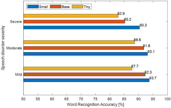 The following experiments had distinct objectives. First, with the collaborative effort of sixteen individuals having speech and motor disabilities, we studied the performance of the aforementioned variants of OpenAI’s Whisper ASR architecture by considering the Word Recognition Accuracy (WRA) as the main performance indicator. This is a common metric for isolated word recognition tasks, and it expresses the percentage of the number of words the ASR models correctly identify to the number of words attempted, i.e., the size of our testing dataset. We employed this metric because we treated the problem of recognizing single speech commands as a multi-class classification task.