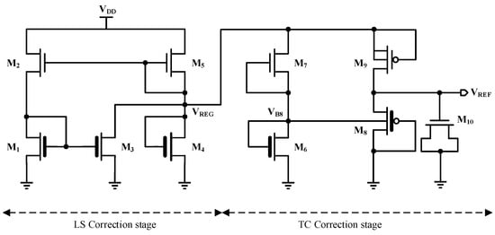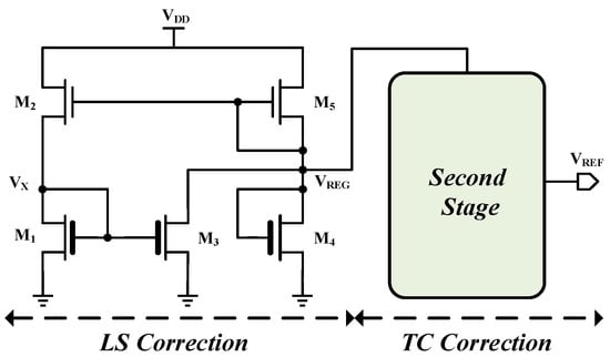 The introduction of a two-stage circuit is another way to enhance LS []. In such references, the supply voltage primarily affects the reference voltage via the DIBL effect. To counteract the DIBL effect, a current proportional to the supply voltage is subtracted from the bias current of the output reference voltage branch []. This approach improves the LS from 1100 ppm/V to 190 ppm/V. By combining a two-stage structure with a DIBL compensator, the voltage reference circuit presented in [] achieves an LS of 143.8 ppm/V. The LS and TC corrections are carried out in the structure’s first and second stages, respectively. However, the curvature of the output voltage versus temperature characteristics in [] cannot be altered because all transistors in the second stage are nMOS.