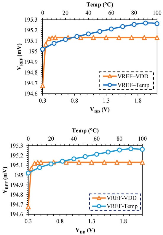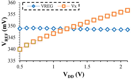 To compensate for DIBL’s effect, the expression in the logarithm argument should be independent of the drain-source voltages of M2 and M5. In the circuit design, transistor dimensions are chosen so that VDS2 ≈ VDS5 ≈ VDS. Also, VREG is assumed to be constant. In Figure 2, the simulation results show that the VREG and VX mean values are 348.7 mV and 349.3 mV, respectively. With these criteria, the following expression is obtained by differentiating the argument of the logarithm in (6) with respect to VDS and setting it equal to zero.